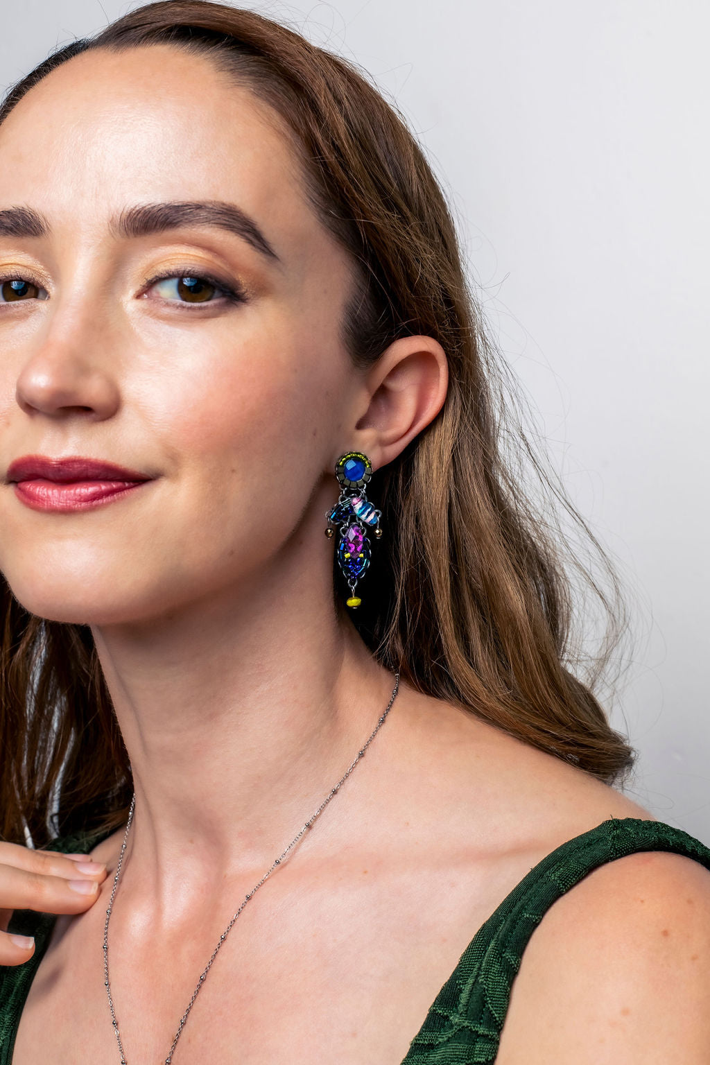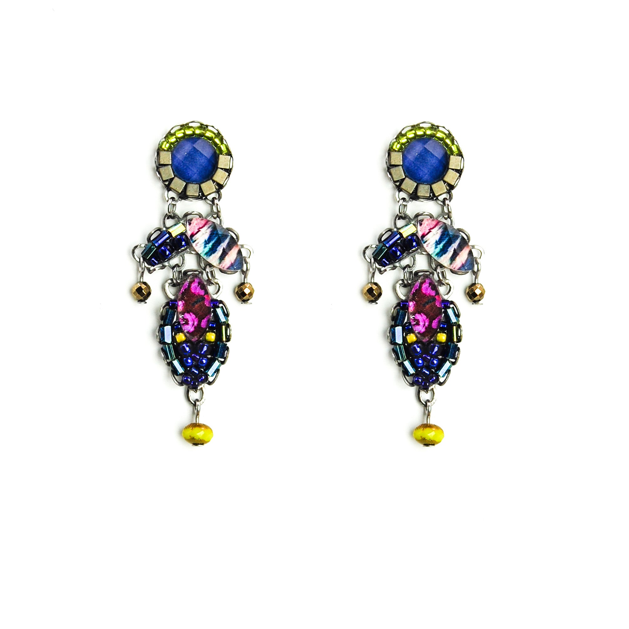 Materials: Various glass, metal and gemstone beads. Hypoallergenic and lightweight stainless-steel setting and ear pins.